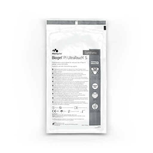 Biogel PI UltraTouch S is a surgical glove made from synthetic polyisoprene excluding chemical accelerators known to cause skin irritation, such as Thiazoles, Thiurams, Carbamates, Thioureas and Diphenylguanidine.1 It is also manufactured without CPC (Cetyl Pyridinium Chloride). The Biogel PI UltraTouch S provides the same great feel, comfort and protection as any Biogel glove. It can be worn alone or in combination with the Biogel PI UltraTouch S Indicator Underglove to create a Biogel Puncture Indication System with Best-in-Class perforation detection.- Glove, Polyisoprene, Powder-Free, Anti-Slip, Beaded Cuff, Size 8.5, 50 pr/bx, 4 bx/cs 14-21 Days