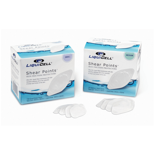 The ultra-thin and nearly invisible liquid-filled membranes of LiquiCell Shear Points allow the body to glide or float with an object aiding in the reduction of shear and friction of the skin. They can be applied to the bridge of the nose, orbits of the eyes, ears, back of the heel, or any other body area at risk of skin breakdown due to the presence of shear and friction. Excellent for use with oxygen masks, oxygen tubing, CPAP masks, braces, casts or any other medical device that contacts the skin. Both small and medium shear points are packaged in 100-count boxes containing 10 packs of 10 shear points each.- Shear Points, Medium, 100/bx Mfr. Direct