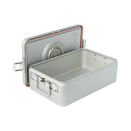 STERISET 3/4SZ 18X11X6.3 GRY Cost-Effective Steriset� Containers Are Safe, Secure and Reusable. These sterilization containers have a solid double lid for maximum protection during transport and complete hygienic security. The ThermoLock locking system eliminates the need for disposable, tamper-evident locks/arrows; and the automatic valve eliminates disposable filters, assuring reliable, economical sterilization. Models with temperature-activated condensate drains remove excess condensation from the container. Color Code Your Steriset Containers. If you wish to, you can order Steriset containers with colored lids or handles instead of the standard gray. This may help you categorize your containers by procedure or operating team. To specify a color other than gray, simply substitute the correct letter in the order number. (Note: Stainless steel lids cannot be colored. Color-coding Steriset lids or handles adds 6-8 weeks to delivery.) Example: WAG2VC17ASA (container with standard gray lid and handles). To order Colored Handles: Replace the "S" with: R=Red; Y=Yellow; K=Black; B=Blue; W=White; O=Orange; G=Green; N=Brown. Example: WAG2VC17ARA (container with red handles). To Order a Colored Lid: Replace the "A" with: R=Red; Y=Yellow; B=Blue; P=Purple; G=Green. Example: WAG2VC17RSA (container with red lid). Three Quarter Size Steriset Containers Perfect for the majority of instrument sets. Aluminum lids. Flat Bottom. Dimensions: 18"L x 11"W x 6"H (46cm x 28cm x 15cm)|Ideal size for a majority of instrument setsCustomizing handle and ID label colors helpcoordinate colors of traysOrganizing sets by procedure with color coding also helps promote best practices andhelps improve efficiency||15|WAG3V13ASA|Z106|||||10080196463121|Z1|10.362LB, 1.144CF PER|10.362 |LB|WAG3V15ASA|PF66397|Steriset Sterilization Container, 3/4 Size, Flat Bottom, Aluminum, Lid, Gray Handle, 18" x 11" x 6" Unit: EA