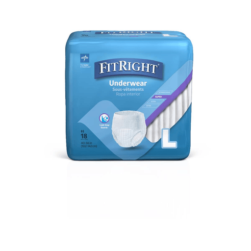 UNDERWEAR PROTECTIVE SUPER L 4/18S Protection Plus Super Protecitve Underwear: This disposable underwear features the "pull up" design that gives patients the comfort and feel of underwear. Anti-leak guards provide for maximum containment. Ultra-absorbent core helps keep moisture away from the skin and controls odor. The breathable outer cover adds to the comfort and provides better skin health. Large, 40"-56". Blue stitching. 72/cs, 18/bg.| Superabsorbent core and soft antileak guards help keep moisture away from the skin and control odor Features a body-contoured design for a discreet fit The soft materialis comfortable against skin Size small fits 20"-28" waist, medium fits 28"-40", large fits40"-56", XL fits 56"-68" and 2XL fits 68"-80"|CCI|82|COV1445|XREF|FIT23505A|Z106|||10080196732562|Z1|0.180LB, 0.020CF PER CS|0.180 |LB|MSC33505|PF01519|FitRight Super Protective Adult Underwear, Size L, for Waist Size 40"-56" Unit: CS
